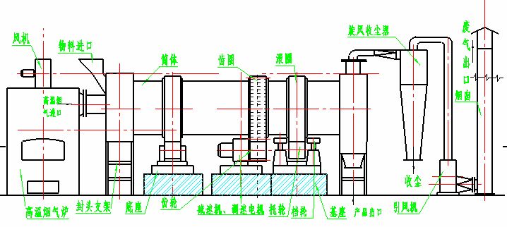 干燥的濕物料由皮帶輸送機(jī)或斗式提升機(jī)送到料斗,然后經(jīng)料斗的加料機(jī)通過加料管道進(jìn)入加料端。加料管道的斜度要大于物料的自然傾角,以便物料順利流入干燥器內(nèi)。干燥器圓筒是一個(gè)與水平線略成傾斜的旋轉(zhuǎn)圓筒。物料從較高一端加入,載熱體由低端進(jìn)入,與物料成逆流接觸,也有載熱體和物料一起并流進(jìn)入筒體的。隨著圓筒的轉(zhuǎn)動(dòng)物料受重力作用運(yùn)行到較底的一端。濕物料在筒體內(nèi)向前移動(dòng)過程中,直接或間接了載熱體的給熱,使?jié)裎锪系靡愿稍铮缓笤诔隽隙私?jīng)皮帶機(jī)或螺旋輸送機(jī)送出。在筒體內(nèi)壁上裝有抄板,它的作用是把物料抄起來又撒下,使物料與氣流的接觸表面增大,以提高干燥速率并促進(jìn)物料前進(jìn)。載熱體一般分為熱空氣、煙道氣等。載熱體經(jīng)干燥器以后,一般需要旋風(fēng)除塵器將氣體內(nèi)所帶物料捕集下來。如需進(jìn)一步減少尾氣含塵量,還應(yīng)經(jīng)過袋式除塵器或濕法除塵器后再放排放。